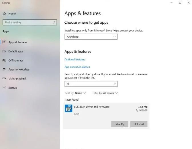9. Confirmation: As we sort of did before during the uninstall of the old firmware, we can go to “Apps and features”, search for “SL1”, click on “SL1 J2534 driver and firmware” to confirm which version it has been updated to. In this case it is 0.90 so we are good to go.