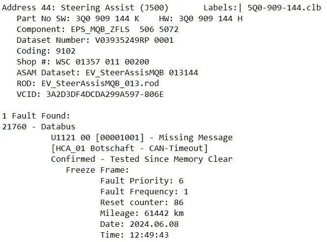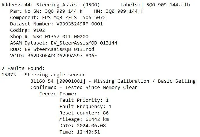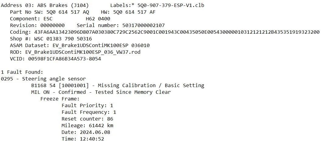 The steering angle sensor fault fix was easy. We just had to perform the steering angle sensor relearn via VCDS.