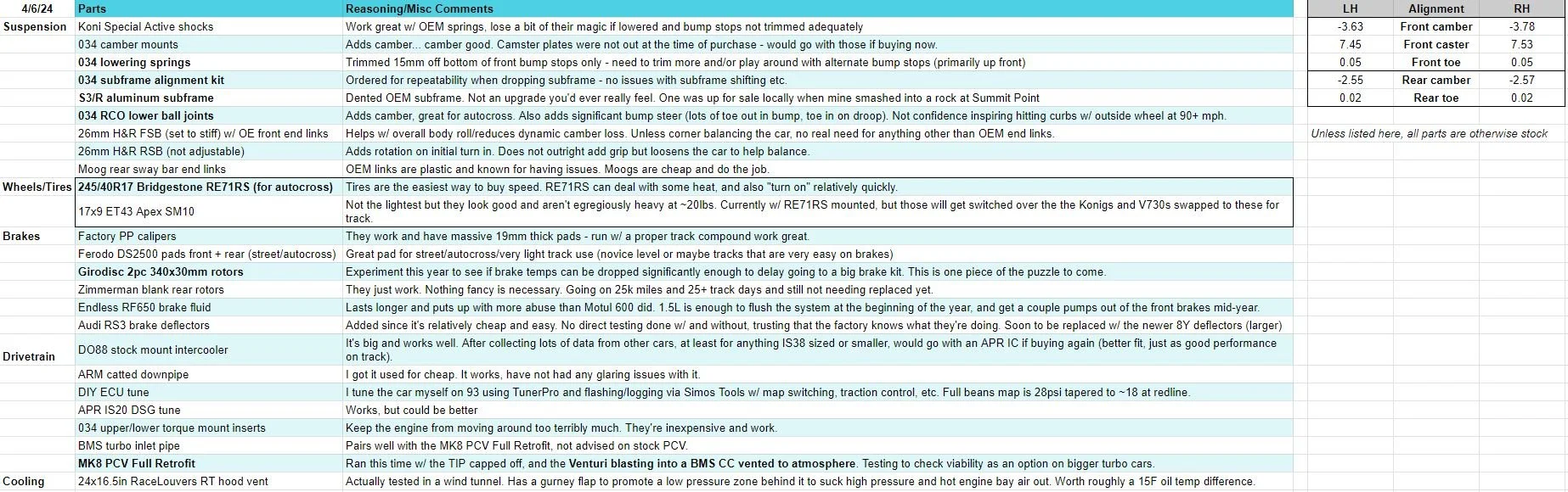 Looking back at past Trip Reports, I wish I’d done a better job of documenting changes made to the car, etc. on a per-event basis. I’m going to attempt to start dropping a snip of this spreadsheet w/ each event to keep track of changes.