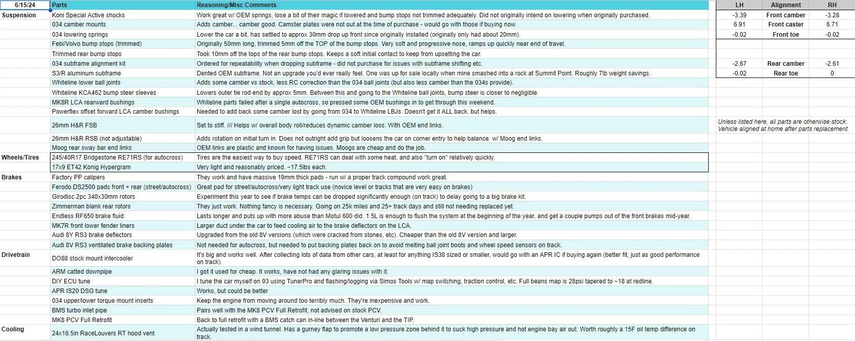 No real changes since VIR, though the LCA bushings are back to OEM MK8 bushings to get by for now