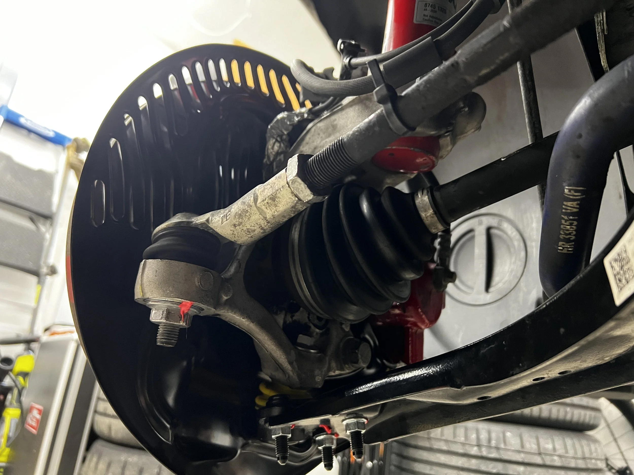 We had some rain and lightning mid-day which caused missing one session, but the track dried out quickly so the V730s weren’t even an issue there. It was a pretty consistent 80-82F ambient temp the entire day which is never great for making power. I was down a few mph on the back straight vs February, but still faster than my 2:12.55 personal best from May of 2023. I spent the majority of Friday just focusing on regaining my confidence pushing speeds in the esses… which was a LOT easier with the ball joint and bump steer correction changes. The car now doesn’t have any kind of side to side shimmy when hitting curbs, etc. I was in a rush to get the car together so did not take formal measurements, but it is blatantly visible when watching the car get lifted or lowered on the Quickjacks - to be shared in a future article.