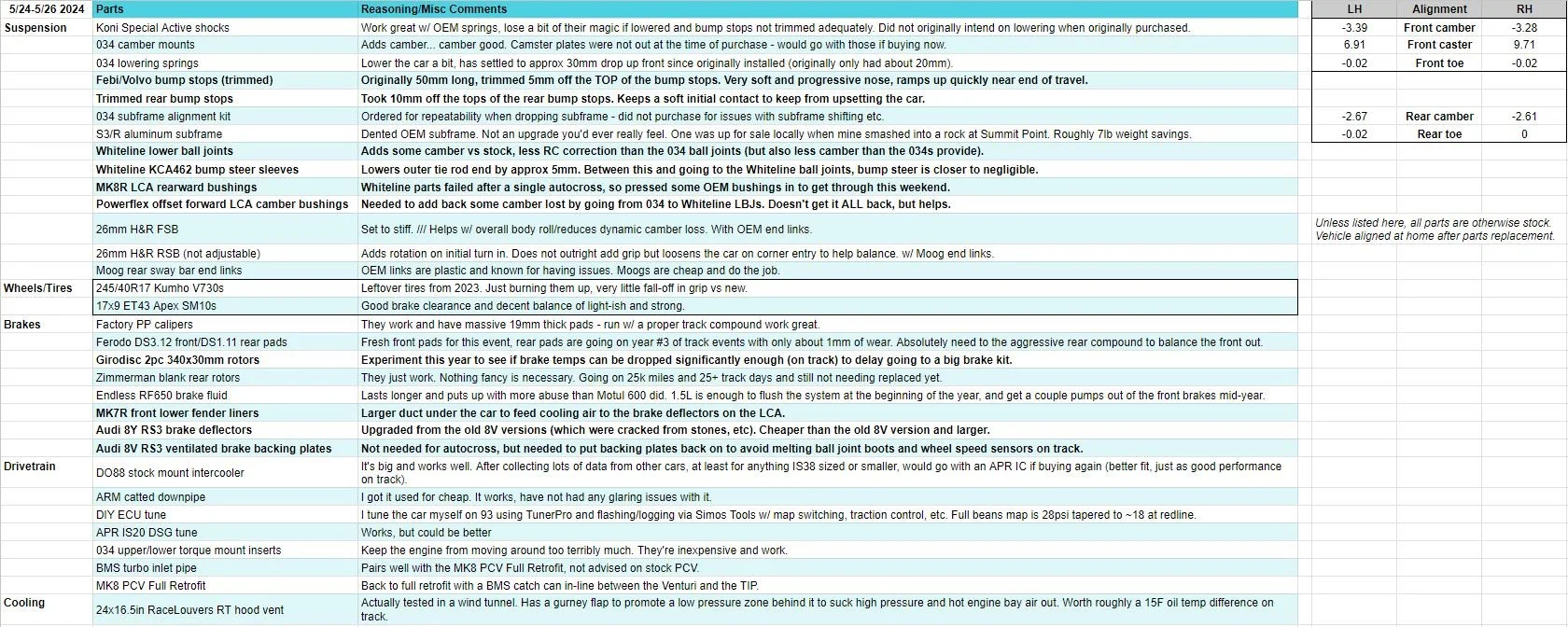For a quick recap of changes since VIR in February (bolded), here’s a list of how the car was set up for this event: